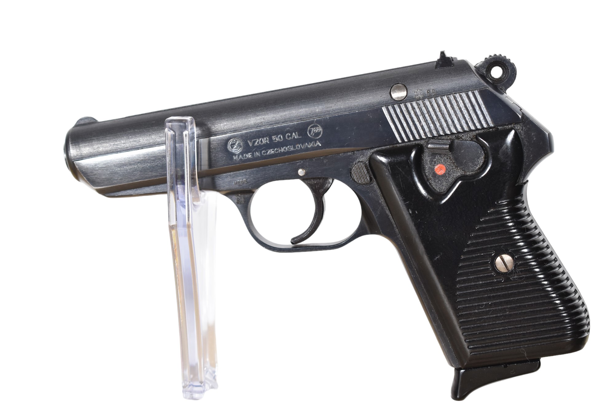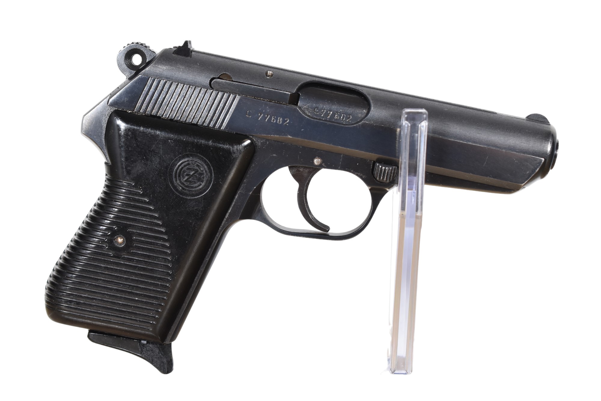 Die Brünner Waffenwerke 7,65mmBrowning ist eine Pistole mit einer Lauflänge von 9,5 cm und einem Gewicht von 0,7 kg. Sie hat eine Magazinkapazität von 8 Schuss und befindet sich im Zustand 2-, was normale Gebrauchsspuren bedeutet. Die Griffschalen bestehen aus Kunststoff. Der Beschuss stammt aus dem Jahr 1969.