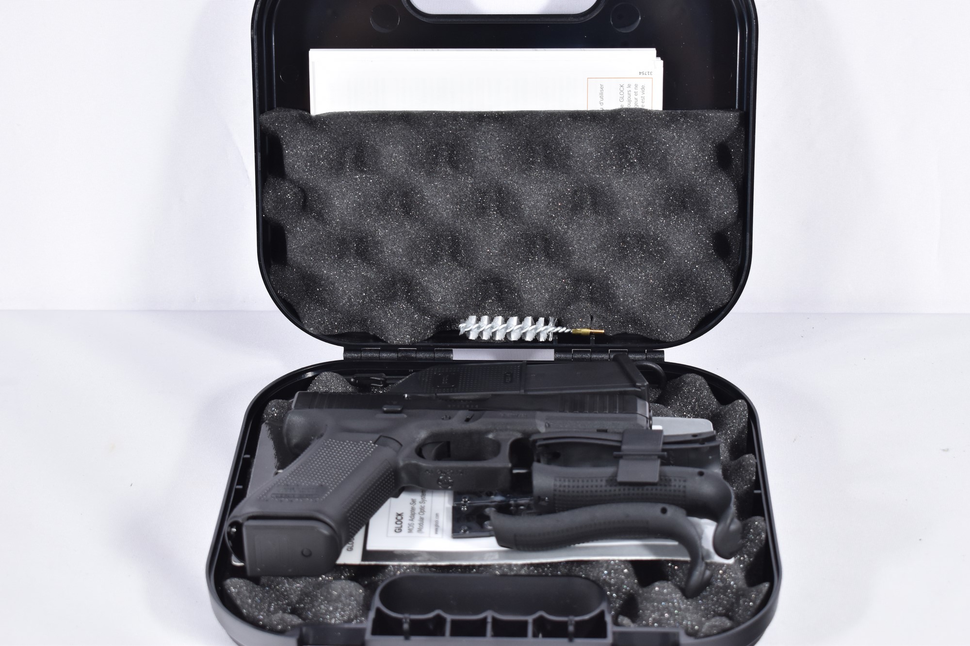 Waffe, Glock Pistolenkoffer, Ersatzmagazin, Bedienungsanleitung, Ladehilfe