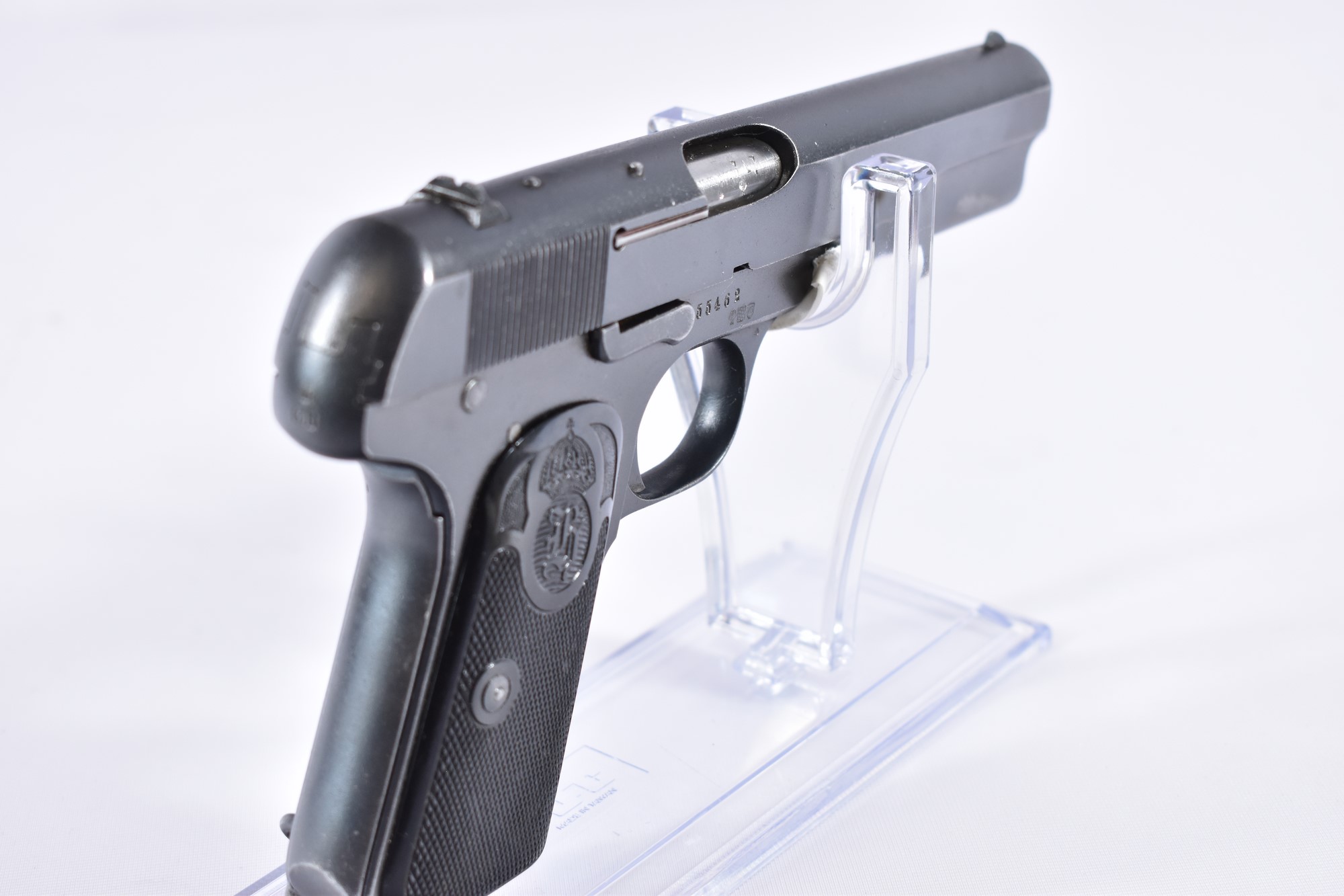Diese Husqvarna M1907 Pistole im Kaliber 9mm Browning Long hat eine Gesamtlänge von 20,5 cm und eine Lauflänge von 13 cm. Sie wiegt 920 g und befindet sich im Zustand 2-3, was normale Gebrauchsspuren mit mittelstarken Dellen und/oder leichten Kratzern bedeutet. Die Pistole ist mit Kunststoffgriffschalen ausgestattet und verfügt über einen gültigen Beschuss (Mellrichstadt).