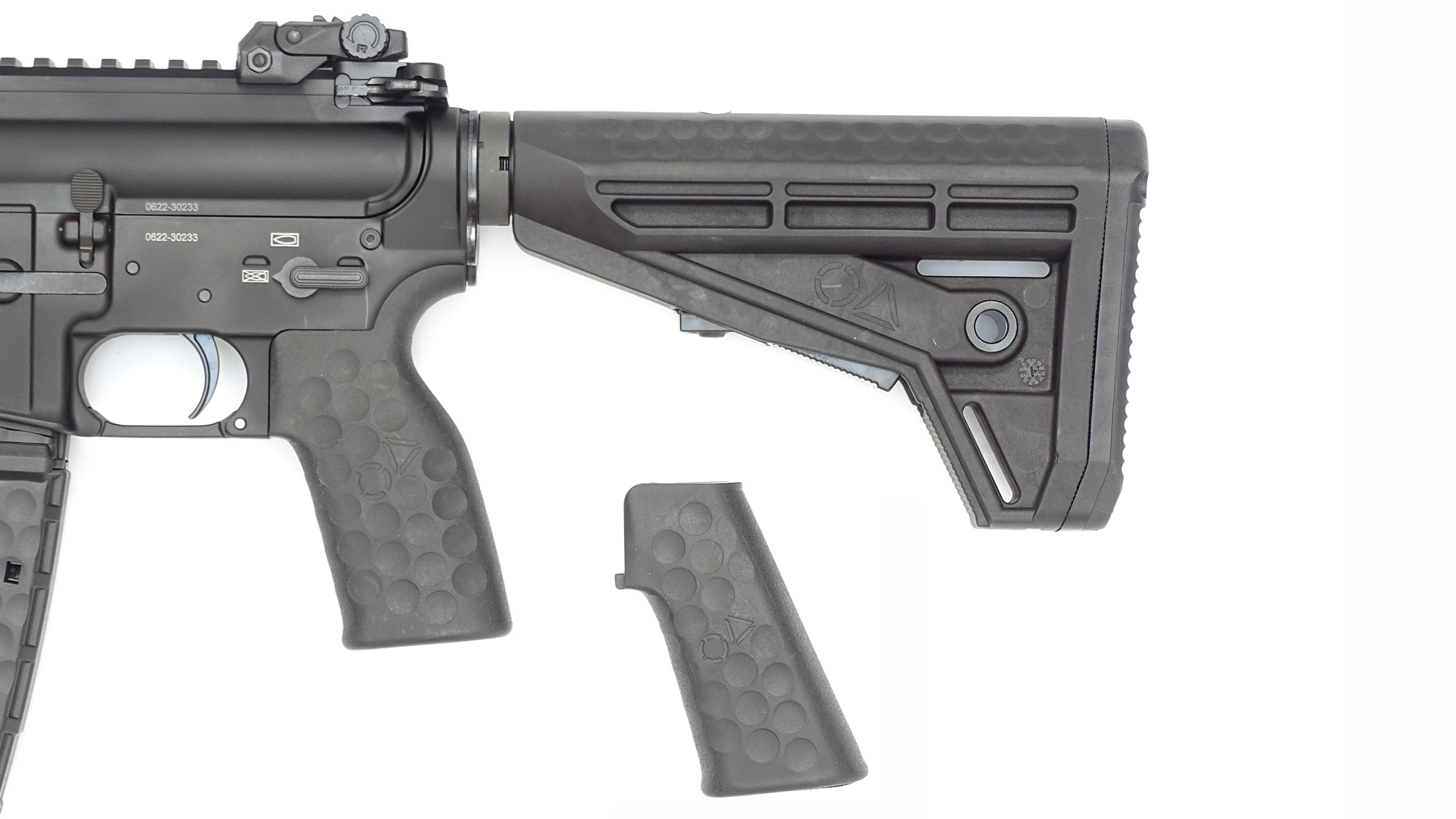 OA MDR M-LOK Handguard 13′, OA M4-Schaft, BUIS, MFD, 2x OA Griff „new generation“ im Golfballdesign (15°) in den Größen M und L, 1x 10 Schuss OA Active Magv